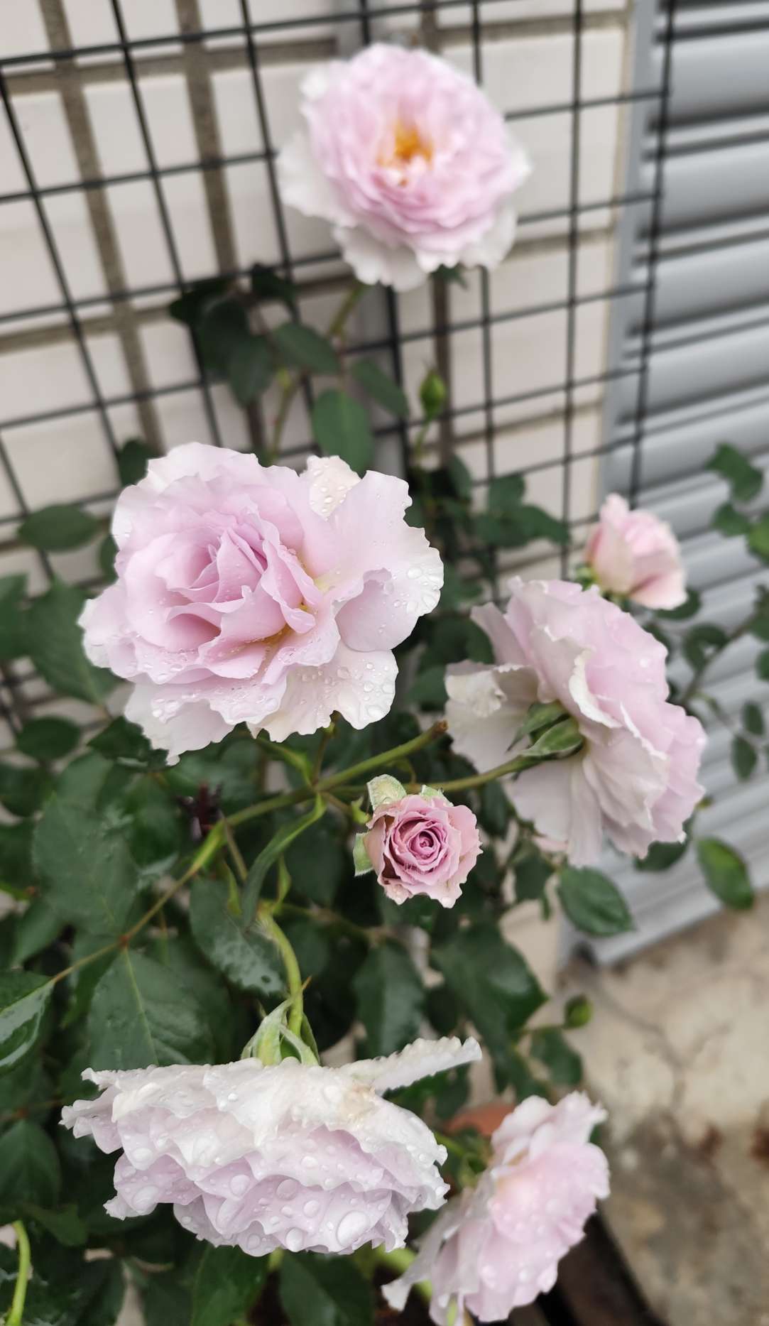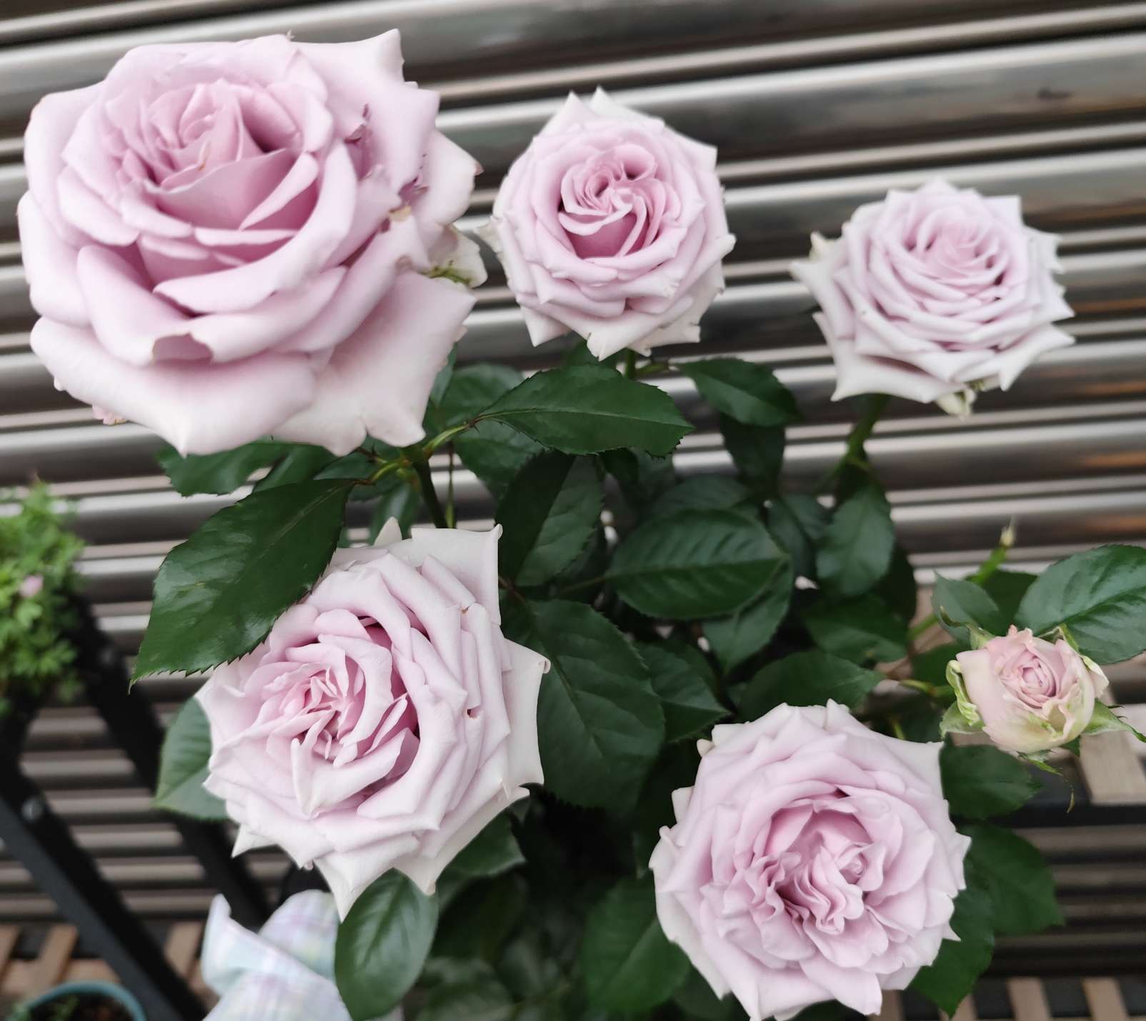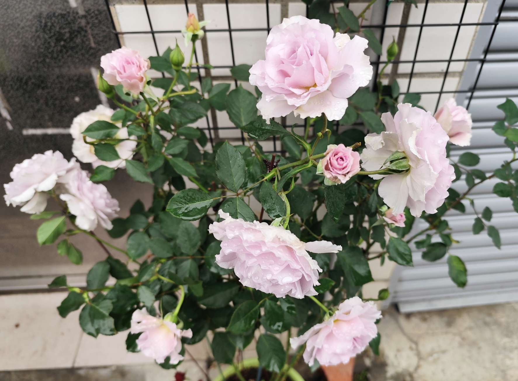 銀色光芒,4/9拍攝,八吋盆植,這是一支強筍開出的花,七大朵,一朵斷了剪除。這氮肥施過多,所以枝條超過五尺,但即便這麼高也不垂頭,花瓣厚實耐開,不淋雨也是能開將近一個月。葉子光亮厚實,不易病害,好種,推薦!