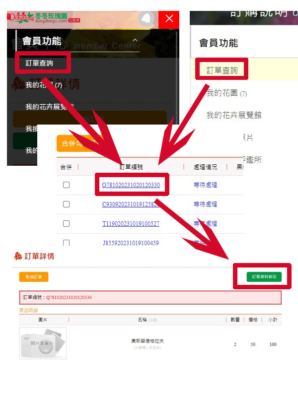 您可以修改購買數量、寄送方式或聯絡方式等資訊,只需於訂單查詢中點選訂單編號連結,進入訂單詳情後,點選「訂單資料修改」按鈕即可。