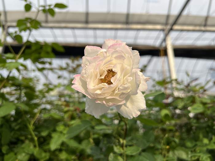 河本純子2012年推出的中輪豐花品種,白色帶些微粉色的波浪瓣花,強香,長勢中等,開花性佳,抗病性較為普通需要定期維護。