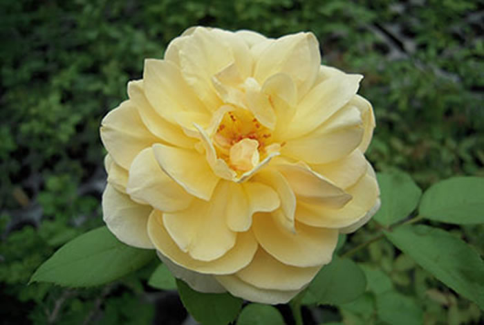 圓瓣簇生,奶油黃。植株直立,適合誘引當作蔓玫,一莖多花。